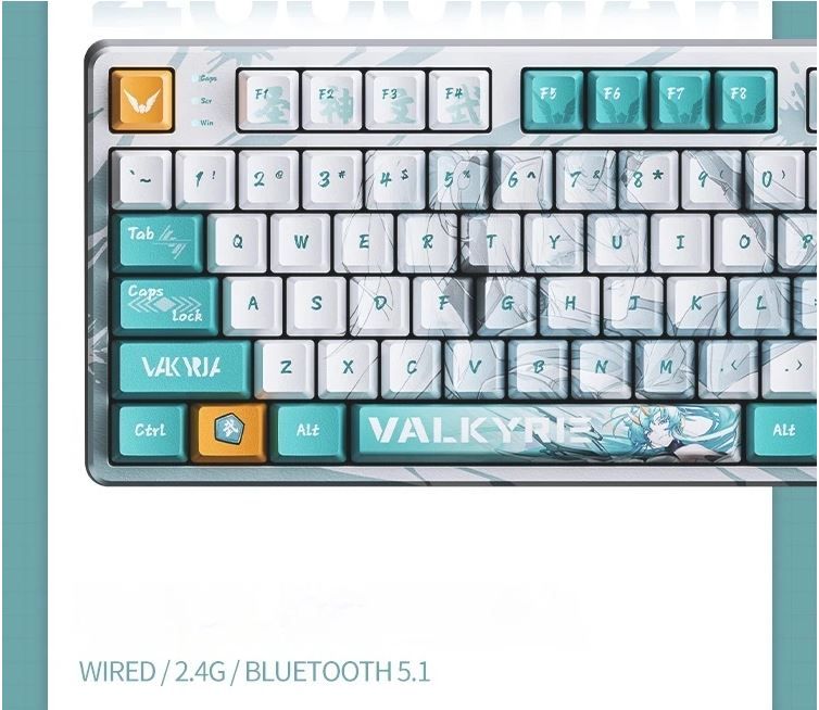Tùy chọn kết nối linh hoạt với tùy chọn kết nối ba chế độ. Bàn phím hỗ trợ các tùy chọn kết nối Bluetooth V5.1 không dây, 2.4GHz không dây và USB Type-C có dây. Bàn phím cũng hỗ trợ chuyển đổi dễ dàng giữa các hệ thống Windows và Mac. Bàn phím cơ Valkyrie VK87 có chức năng đèn nền RGB động với 20 hiệu ứng ánh sáng được tích hợp sẵn trong bàn phím để có thể tùy chỉnh trên bàn phím hoặc kết nối với phần mềm miễn phí từ hãng cung cấp hoàn toàn với các chế độ ánh sáng, cài đặt tốc độ ánh sáng và cài đặt độ sáng ánh sáng khác nhau. Toàn bộ thân vỏ được in hình nhận vật với công nghệ tia UV càng làm tăng vẻ đẹp huyền bí khi có đèn nền.